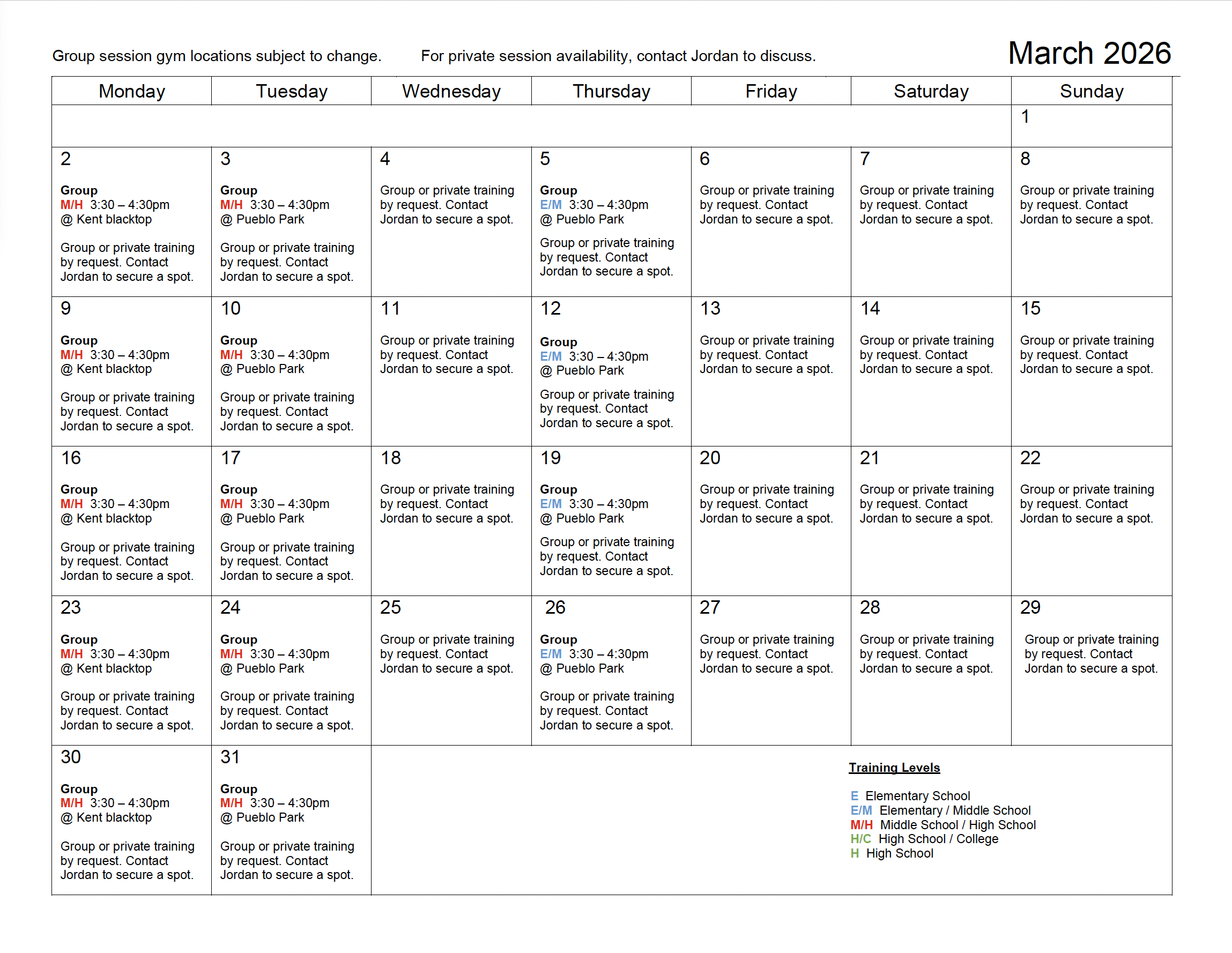 2026 Training Calendar
